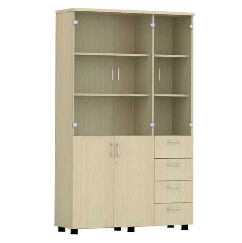 - Tủ 3 Khoang, khoang trên 3 cánh kính, khoang dưới cánh mở gỗ cùng 4 ngăn kéo