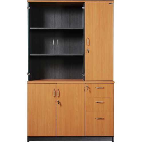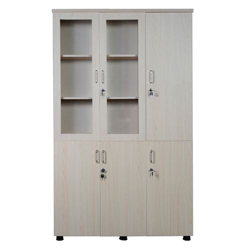 - Tủ thiết kế gồm 3 buồng. Phía trên gồm 2 khoang cánh kính để tài liệu và một khoang treo quần áo, phía dưới có 3 cánh gỗ mở.